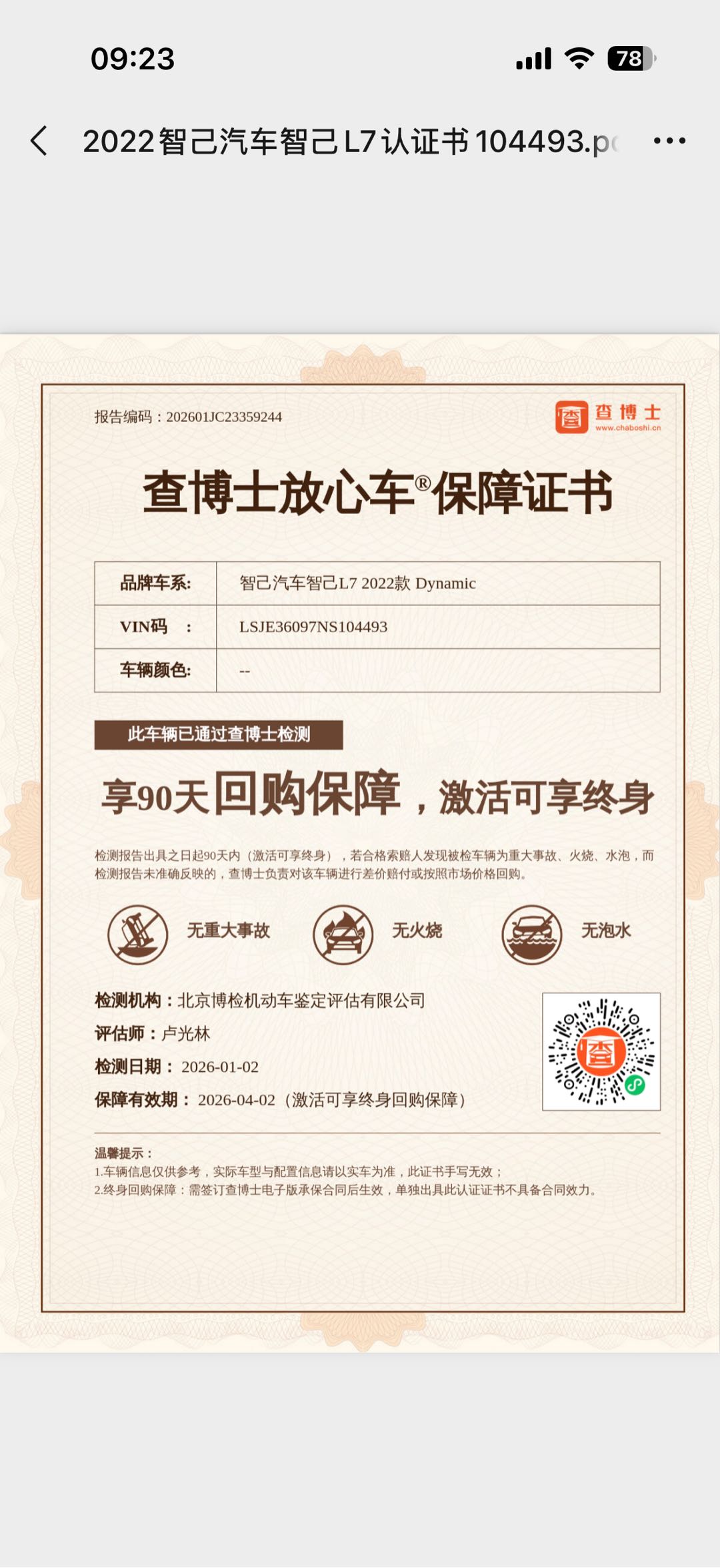 可通过检测报告了解车辆真实情况,明确车辆整体状况,车源放心